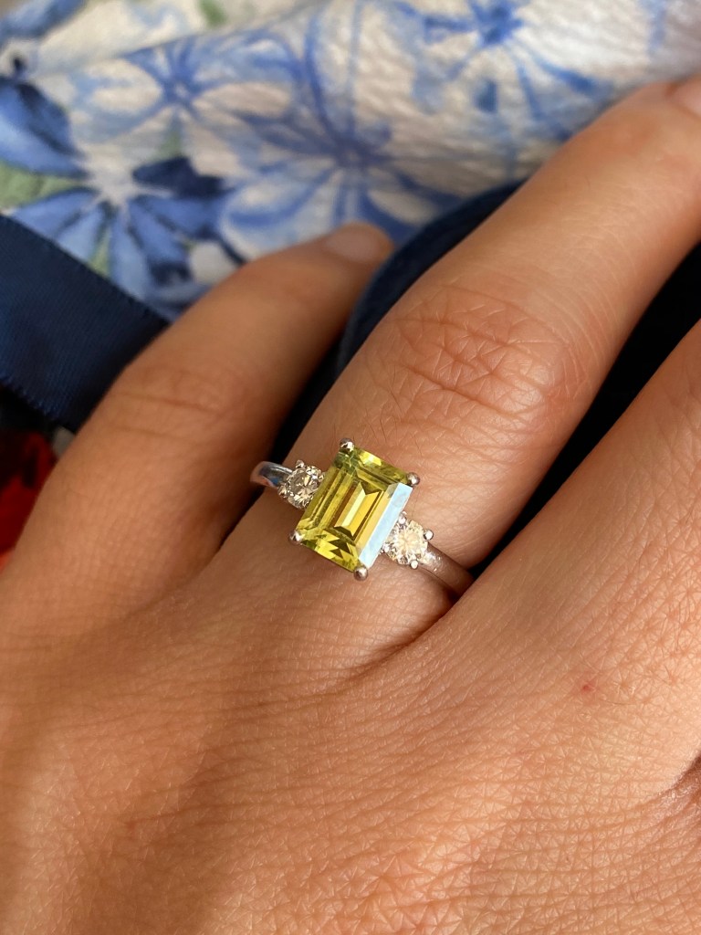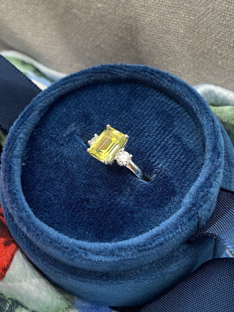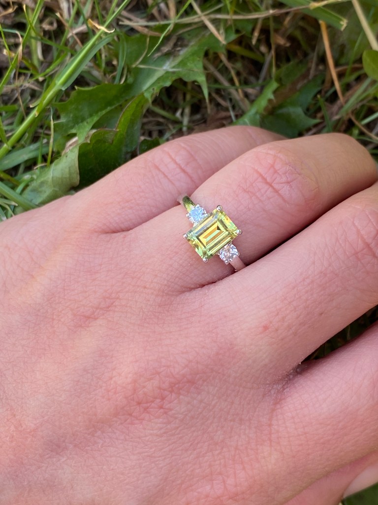 When the stone arrived it was a lovely bright yellow/green colour. The seller had described it as ‘Yellow’ however I have had some people comment on my ‘green’ stone. There are definitely some tinges of green in the colour, which is to be expected from an Australian sapphire – there are some lovely Parti Sapphires mined in Australia, which are a blue/yellow/green mixed colour sapphire. I love the colour of the stone, however I do still want a pure yellow gemstone for my collection – perhaps a chrysoberyl or a diamond (!).